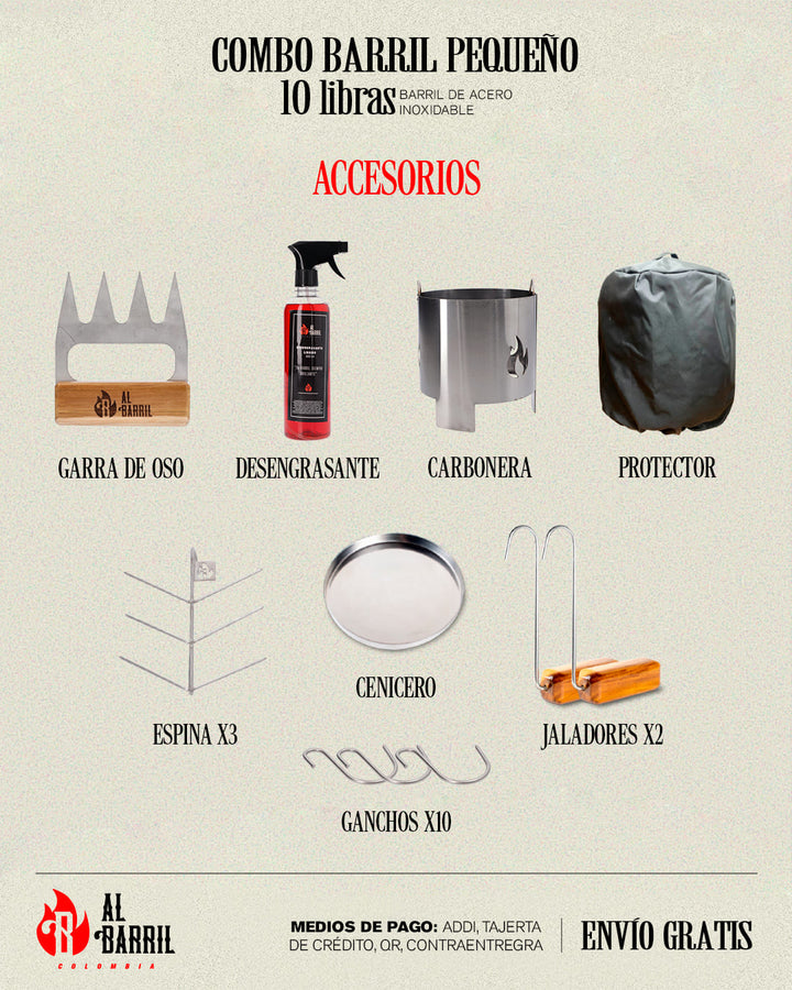 El Combo 10 LB es ideal para quienes quieren un barril compacto, funcional y con todo lo necesario para empezar a asar. Perfecto para parrilleros que buscan calidad y rendimiento en poco espacio.
