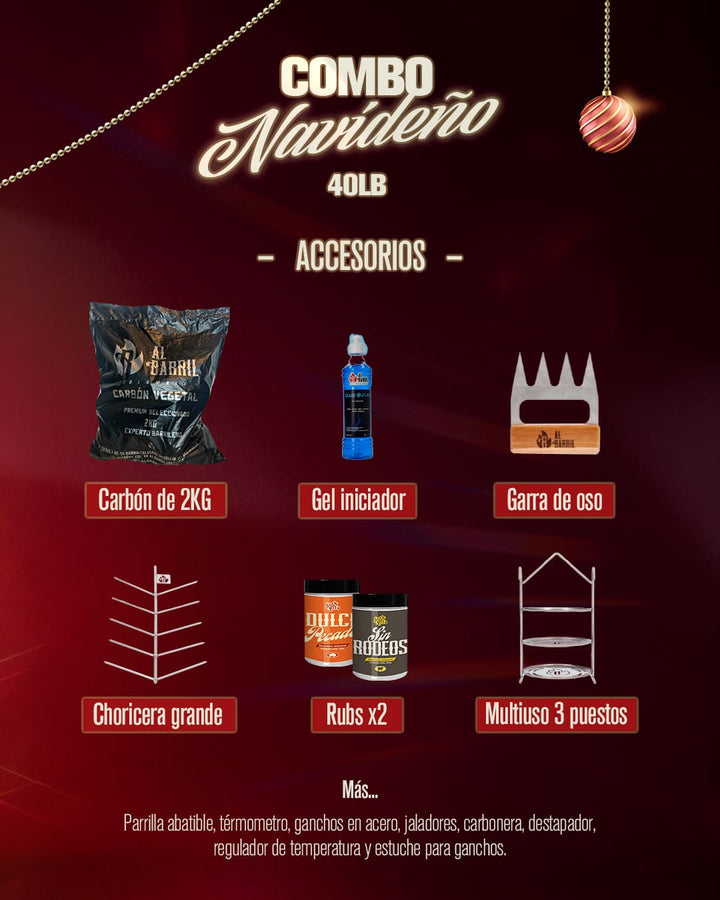Este Combo Navideño trae todo lo necesario para encender el carbón, cocinar sin estrés y disfrutar resultados jugosos y llenos de sabor. No necesitas comprar nada por aparte. Solo encender, colgar tus cortes ¡y disfrutar!